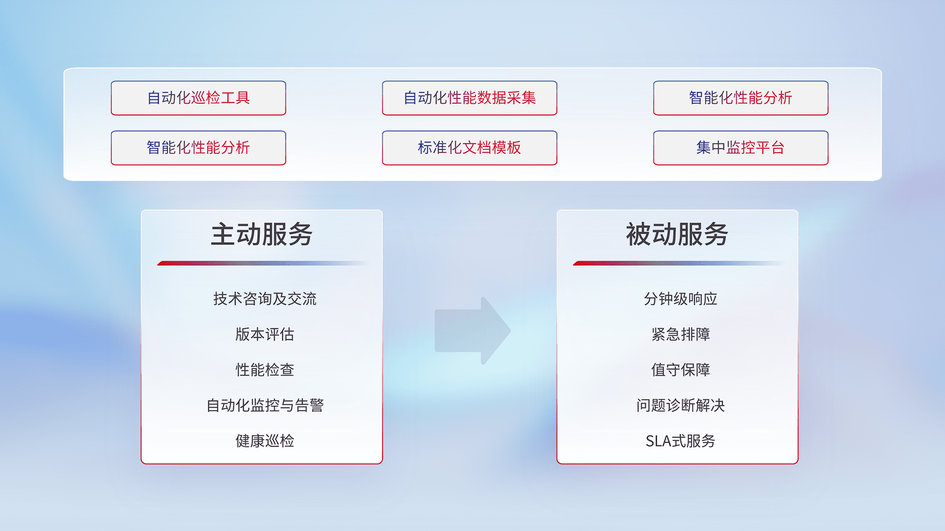 智能化工具和标准化文档,,保障服务质量,,提供主动服务(包含技术咨询、、、、版本评估、、性能检查、、、自动化监控与告警、、、、健康巡检)和被动服务包含(分钟级响应、、、、紧急排障、、值守保障、、、、问题诊断解决、、SLA服务)。。。。