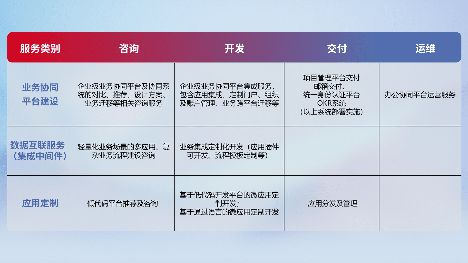 针对钉钉、、、企微、、IDaas等平台级产品提供产品的规划、、方案、、交付、、、定制化开发等服务,,,实现如统一协同办公、、、智能客户服务、、、、混合会议管理、、智能数据查询、、、、等业务场景,,,实现数字化转型。。。。